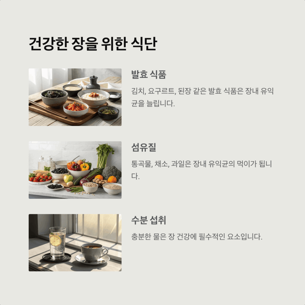 - 통곡물 및 섬유질 섭취 증진: 채소, 과일, 통곡물을 통해 장내 유익균의 먹이가 되는 프리바이오틱스를 충분히 섭취해야 합니다.